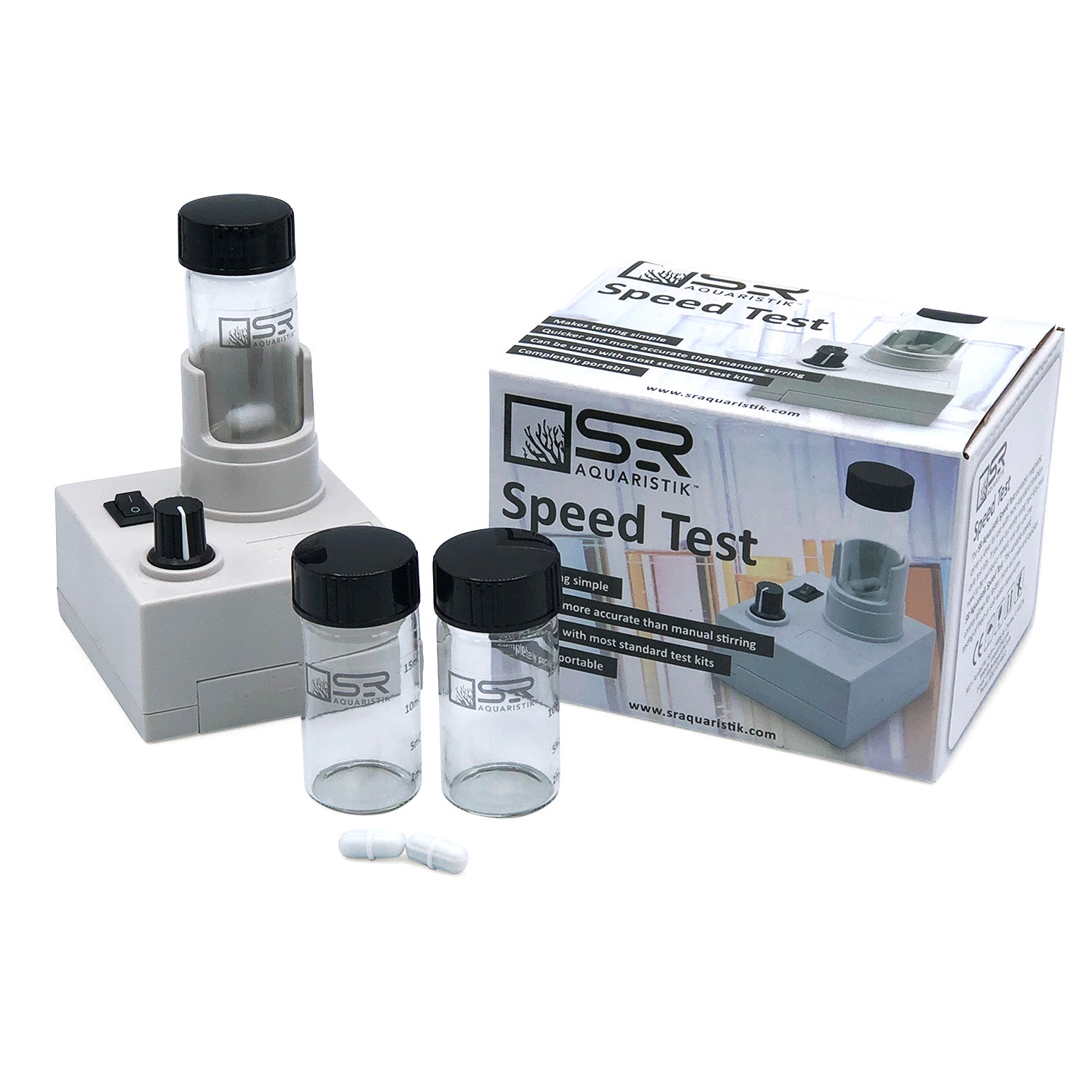 The SR Aquaristik Speed Test Mixer and Accessory Kit includes one speed test, extra vials, and magnetic stir bars, making testing even easier and faster. Extra vials and stir bars enable you to do several tests at the same time, especially important when waiting for test kits that require time for results.