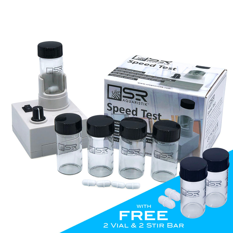 The SR Aquaristik Speed Test Mixer and Accessory Kit includes one speed test, extra vials, and magnetic stir bars, making testing even easier and faster. Extra vials and stir bars enable you to do several tests at the same time, especially important when waiting for test kits that require time for results.